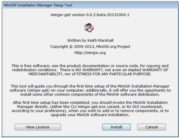 进入下面的对话框,这是一个 名为 “ MinGW Installer Manager ” 的软件,借助它,我们可 以随时根据需要修改 GCC 编译器的配置。