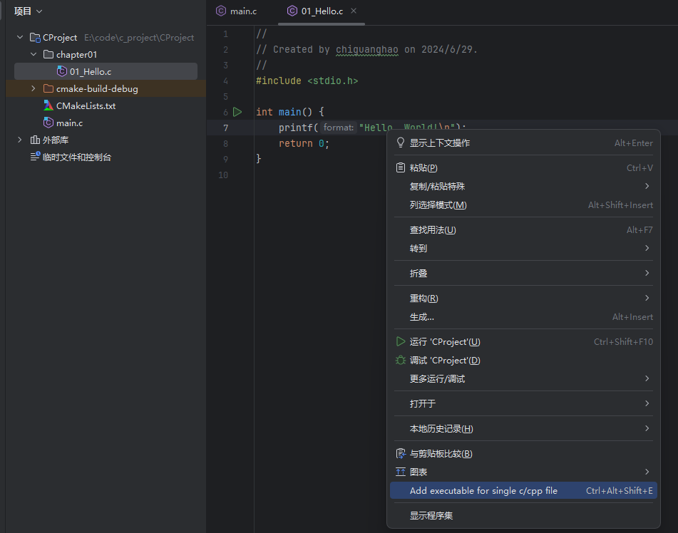 - 将main.c中的helloworld复制到01_Hello.c中