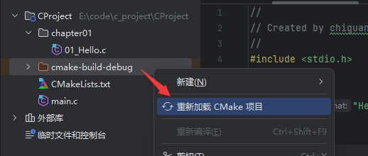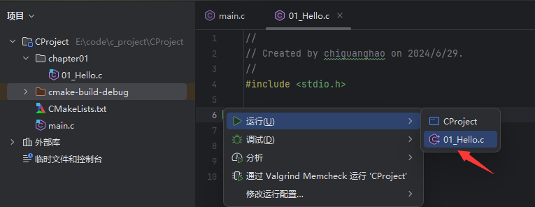 - 在chapter01包下创建01_Hello.c文件