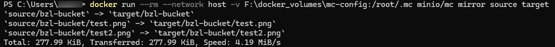 docker run --rm --network host -v F:\docker_volumes\mc-config:/root/.mc minio/mc mirror source target