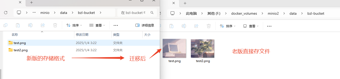 minio/minio:RELEASE.2022-06-02T02-11-04Z之前版本用的是老的存储格式 minio/minio:RELEASE.2022-06-02T02-11-04Z及之后的版本会将文件存成目录的形式
