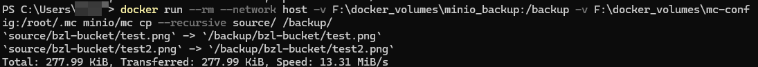 docker run --rm --network host -v F:\docker_volumes\minio_backup:/backup -v F:\docker_volumes\mc-config:/root/.mc minio/mc cp --recursive source/ /backup/
